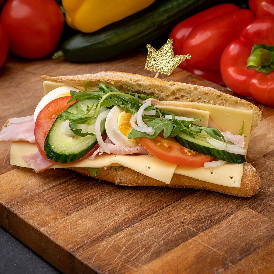 Broodje Gezond, broodje naar keuze, slamix, ruim belegd met plakken jonge kaas, plakken ham, gegarneerd plakjes ei, tomaat, komkommer, rode ui ringen en rucola