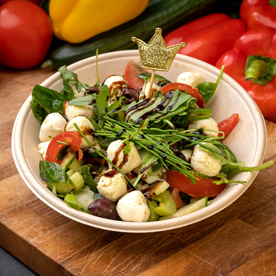 Een ruime lunch salade met als basis slamix, huisgemaakte dressing ( honing-mosterd french dressing), komkommer, bleekselderij met daarop mozzarella-tomaat salade, garnering van rode ui ringen en rucola.